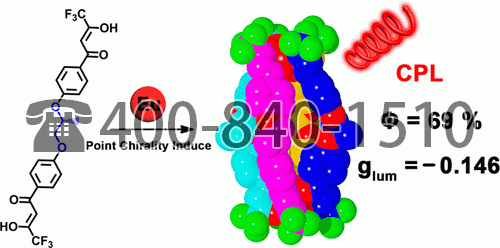Aromatic β-diketones have been extensively employed as highly effective sensitizers in luminescent lanthanide complexes. However, the difficulties to make the chiral modified groups effectively participate in the frontier molecular orbital (FMO) distributions limit their applications on lanthanide circularly polarized luminescence (CPL) fields. Considering the inherent chirality of the helical structure, a pair of enantiopure dinuclear europium quadruple-stranded helicates, ΔΔ/ΛΛ-(HNEt3)2(Eu2L4) (ΔΔ/ΛΛ)-1; L = R/S-1,2-bis(4,4′-bis(4,4,4-trifluoro-1,3-dioxobutyl)phenoxyl)propane are assembled via a point chirality induced strategy. The comprehensive spectral characteristics combined with density functional theory (DFT) calculations demonstrate that the one point chirality at the spacer of the ligand successfully controls the Δ or Λ configuration around the Eu(III) ion center and the P or M helical patterns of the helicates. The mirror-image CPL and CD spectra further confirm the formation of the enantiomer pairs. As expected, the helicate presents a higher luminescence quantum yield (QY) of 68% and a large |glum| value (0.146). This study effectively combines the excellent sensitization capability of β-diketone and the helical chirality of helicates. This strategy provides an effective path for the synthesis of lanthanide material with excellent CPL performance.
