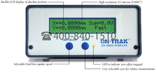 OT-302D 是理想的独立显示模块。前面板的两个按钮可以快速完成模块的设置。按下两个按钮进入配置模式,可选择传感器尺寸、测量单位和显示更新速度。按 FAST/SLOW 按钮退出配置,模块即可显示位置信息。