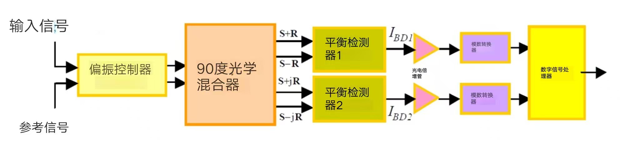 生成的信号随后被导入两对平衡光电探测器,实现同相(I)与正交(Q)分量的差分检测。这种配置使得通过数字信号处理(DSP)可以提取信号的幅度信息和相对相位信息。