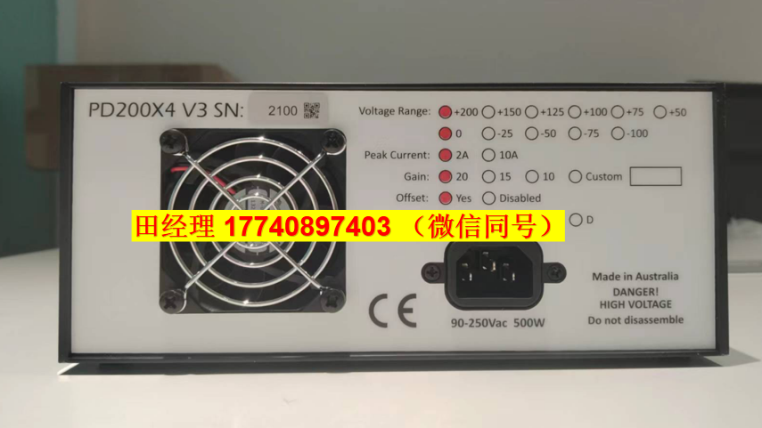 PD200X4四通道功率放大器 提供多种用户控制与订购选项以确保最大应用灵活性:各通道直流偏置可通过前面板电位器调节(可选固定零位配置),正负最大输出电压可通过两个前面板电位器进行限制。前面板15针D-Sub连接器集成输入信号、电压监测、电流监测、温度测量、数字状态输出及数字关断输入功能。