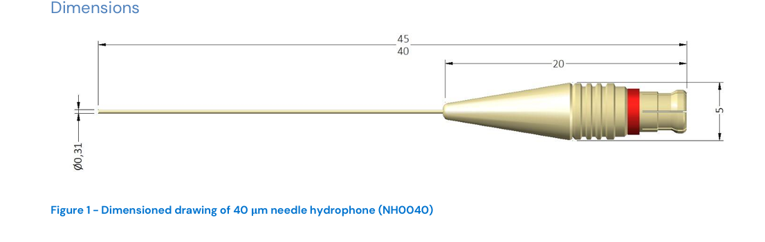 2026年1月6日 杨辉 19821065355(微信同号)英国Precision Acoustics,水听器(NH0040),0.04毫米针式水听器(40微米),用于测量40 MHz以上的高压场英国Precision Acoustics,水听器(NH0040),0.04毫米针式水听器(40微米),用于测量40 MHz以上的高压场0.04毫米针式水听器(40微米)推荐用于测量40 MHz以上的高压场。所有尺寸均以毫米为单位。所有探头都是手工制作的,因此每个设备之间总会有一定差异。40 μm针式水听器是Precision Acoustics Ltd.生产的一系列针式水听器中的一种。它设计用于与潜水放大器和直流耦合器及电源一起使用,以形成水听器系统。每当在本数据表中报告性能时,均指采用40 μm针式水听器、前置放大器和直流耦合器组成的水听器系统的性能。水听器的主动元件尺寸会影响多项性能,包括灵敏度、频率响应、方向性响应、动态范围和等效噪声压力。本技术数据表按照IEC 62127 第3部分[3]编制,提供了40 μm针式水听器系统的详细规格。40 μm针式水听器是该系列中最小的针式水听器,专为高频应用设计,因为其主动元件在19 MHz时的尺寸为半个波长。 0.04毫米针式水听器(40微米) PA NH0040 Precision Acoustics 水听器(NH0040) 用于测量40 MHz以上的高压场 英国PA针式水听器 英国Precision Acoustics 针形水听器
