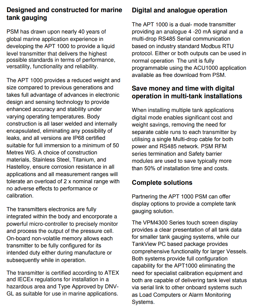 APT1000是一款智能可配置发射器,基于静水压力原理,专为工业压力储罐液位测量应用而设计。作为最新一代产品,APT1000在性能、多功能性、实用性和可靠性方面均达到了最高标准。