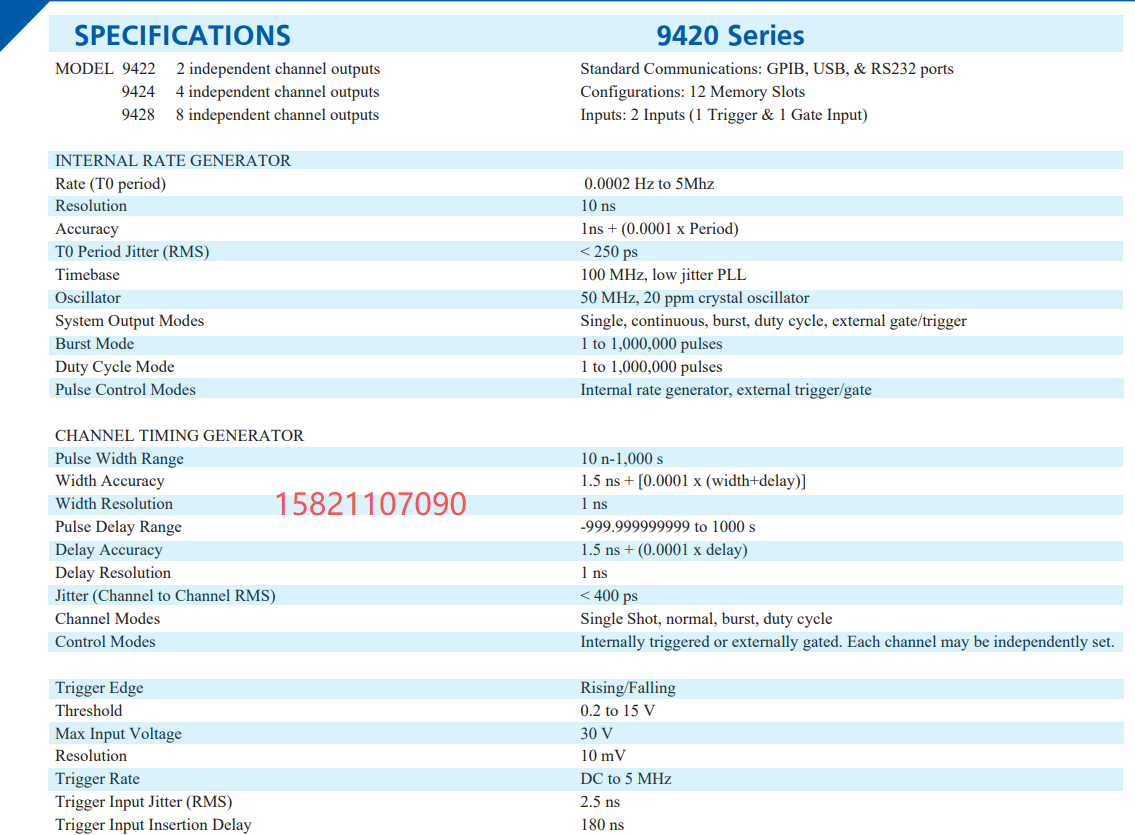 Quantum Composers 9420系列数字延迟脉冲发生器规格: