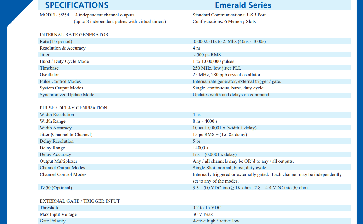 Quantum Composers Emerald 9250是我们数字延迟脉冲发生器系列中的最新产品。该装置设计紧凑但功能强大。具有5ps延迟分辨率和15ps的抖动。标准配备280 ppb的TCXO振荡器,使您在不增加额外成本的情况下获得所需的性能。