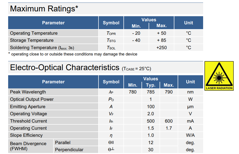 ROITHNER LASERTECHNIK RLT785-1000G红外激光二极管规格: