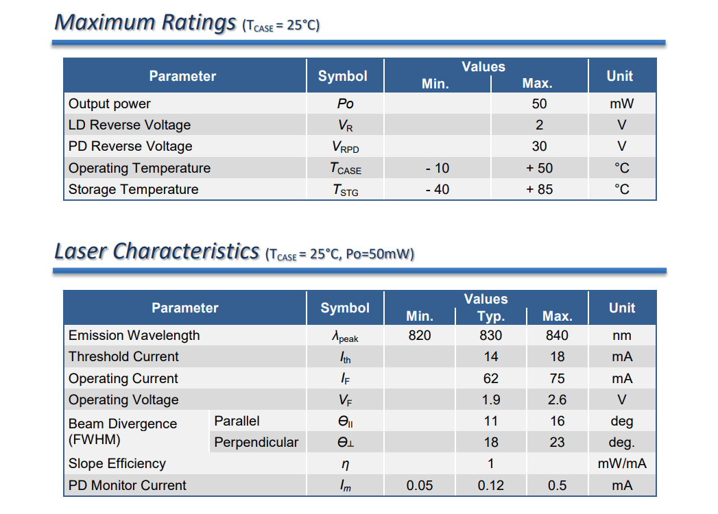 ROITHNER S83500MG 830nm红外单模激光二极管规格: