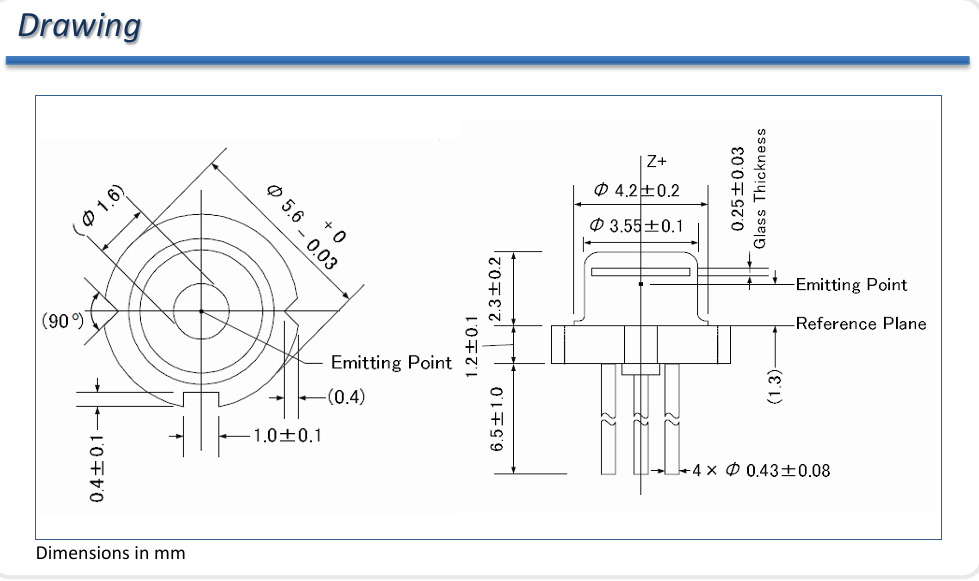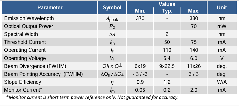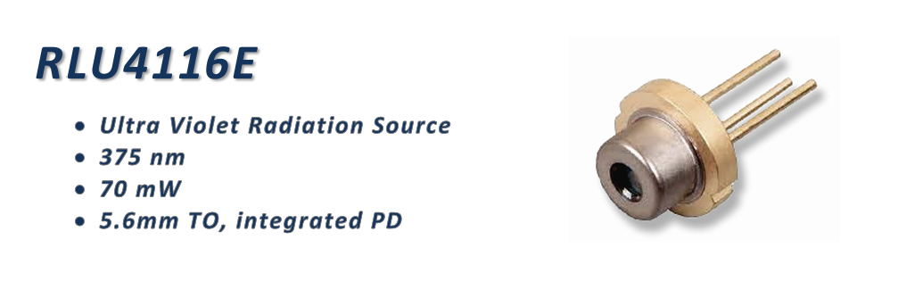 RLU4116E 是一款发射波长为 375 nm 的紫外激光二极管,标准 5.6mm TO 封装,额定输出功率为 70 mW。它具有集成光电二极管和静电放电(ESD)保护电路。