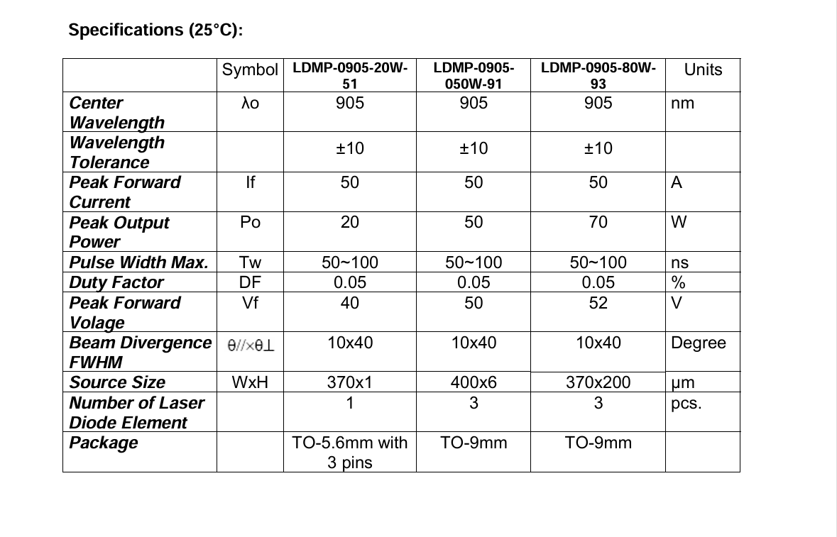 奥地利ROITHNER,脉冲激光二极管,LDMP 系列高功率脉冲激光二极管,904 – 905 nm,LDMP-0905-20W-51,具有 InGaAsP 有源层的 MQW 结构器件,器件设计的脉冲宽度 FWHM 为 50~100ns