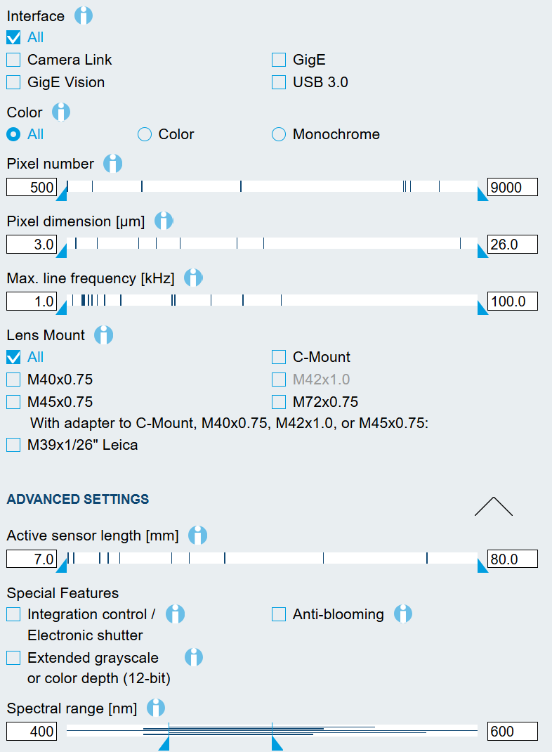 | SK2048MVSH | 2048 | 14 x 14 µm | 28.7 mm | 14.1 kHz | X | X | X | GigE Vision | 8/12 Bit | |