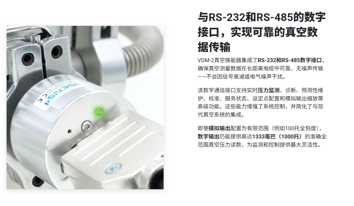 VDM-2真空换能器具备高分辨率模拟电压输出,可直接连接外部显示器、数据采集系统、PLC或过程控制设备,实现实时真空压力监测。