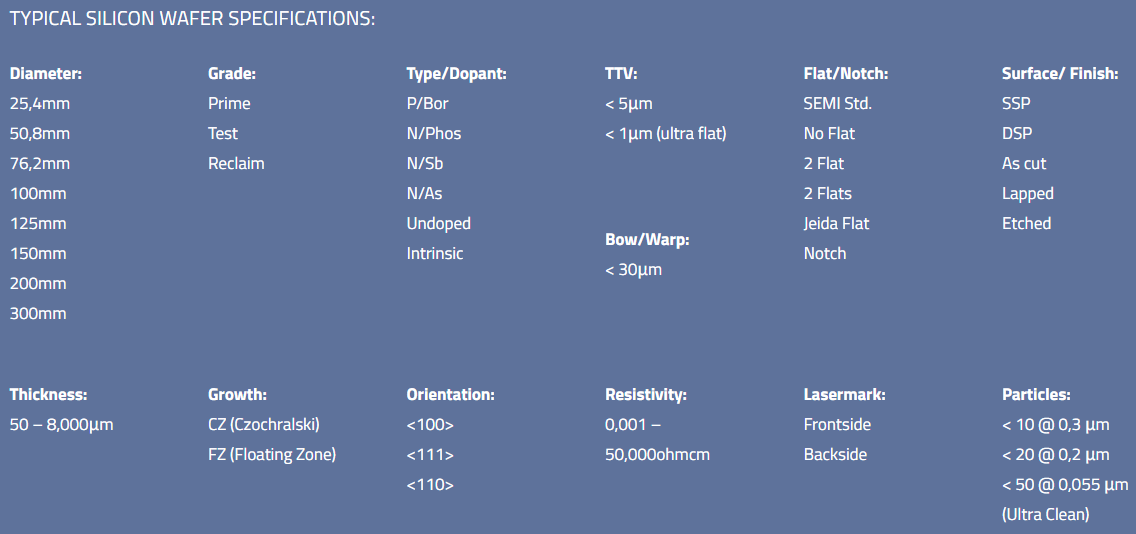 4英寸 标准晶圆——工艺:CZ法,直径:100毫米,厚度:525微米,掺杂:P型/硼 或 N型/磷,晶向:<100>,电阻率:1-30欧姆·厘米,表面:单面抛光,定位边:2个定位边,符合SEMI标准