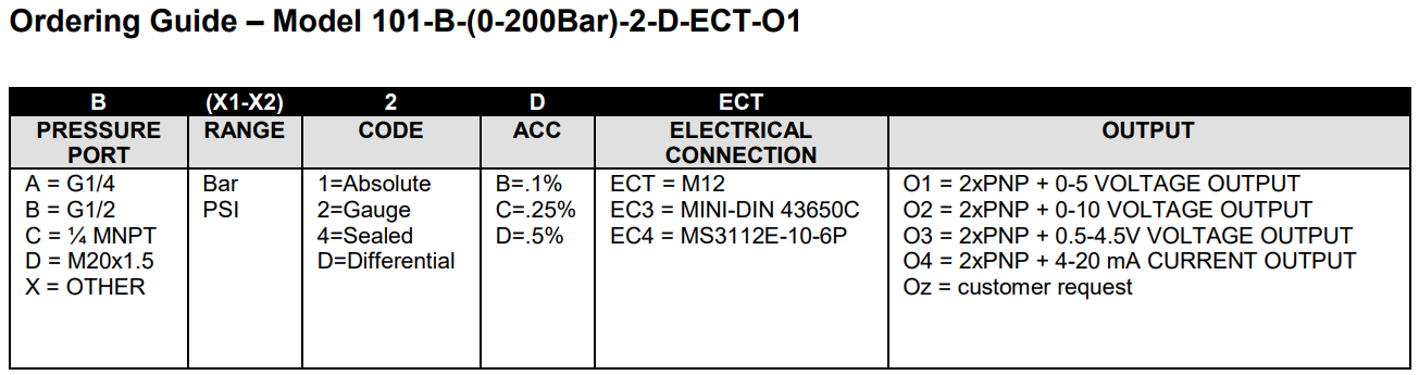 订购型号参考:Model 101-B-(0-200Bar)-2-D-ECT-O1