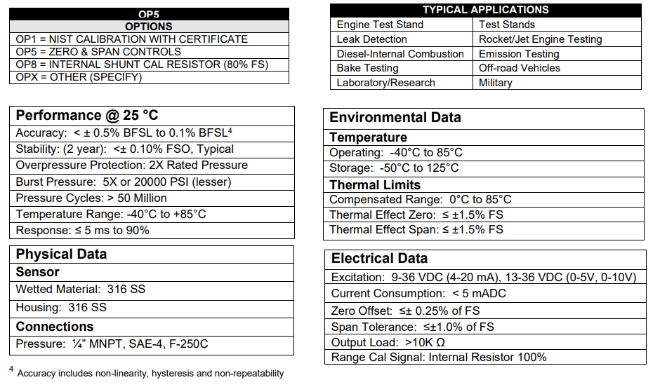 标准压力输出: 4-20 mADC、0-10 VDC、0-5 VDC、mV/V