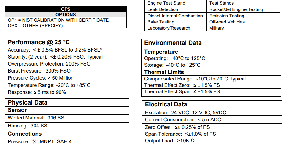 • 压力范围:0-2.5磅/平方英寸至0-10000磅/平方英寸