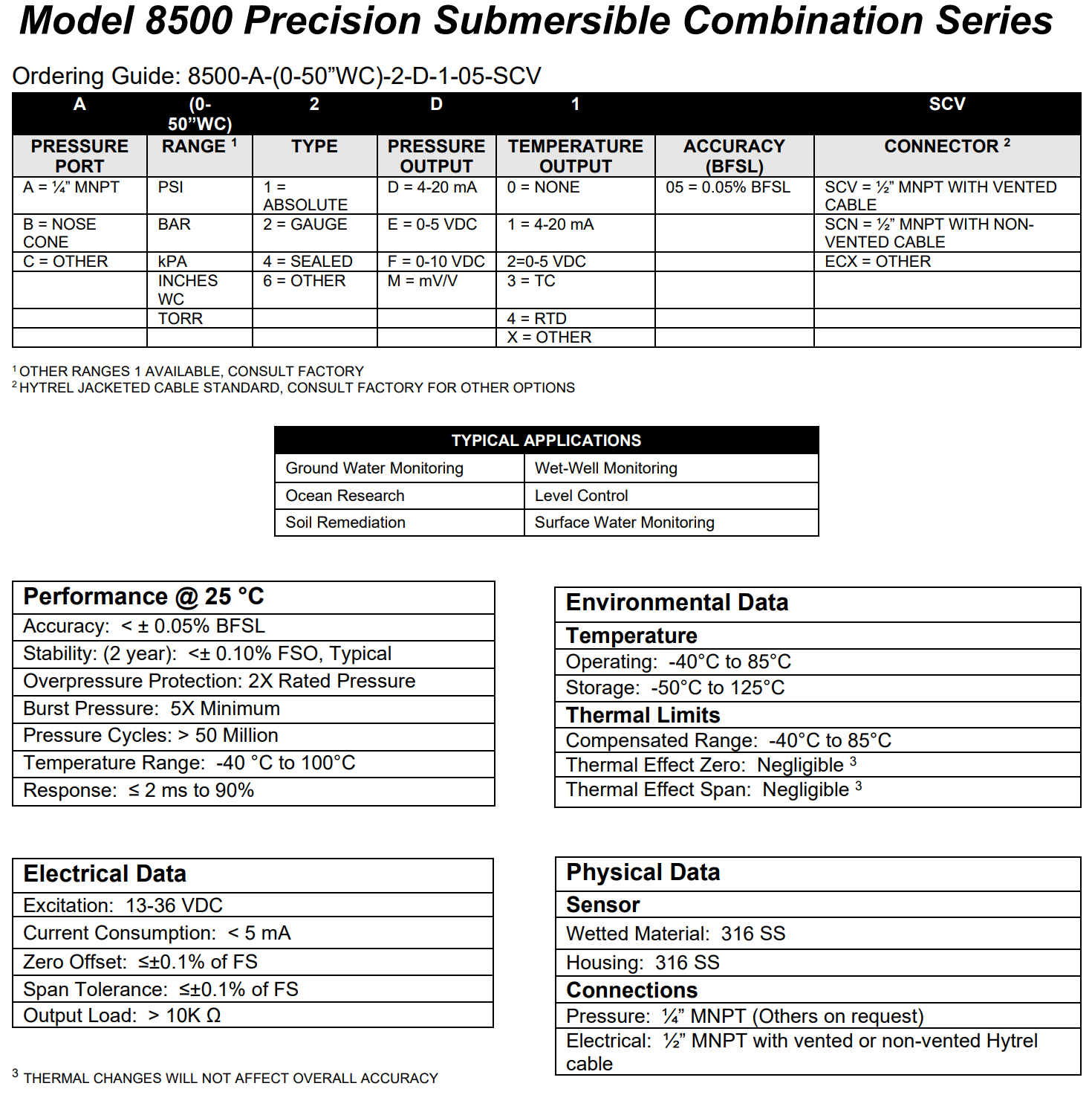 Spectre MODEL 8500 精密压力与温度液位传感器型号及参数