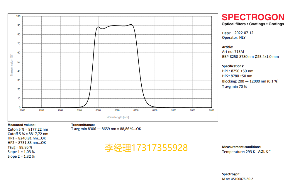 Spectrogon BBP-8250-8780 nm光学滤光片规格: