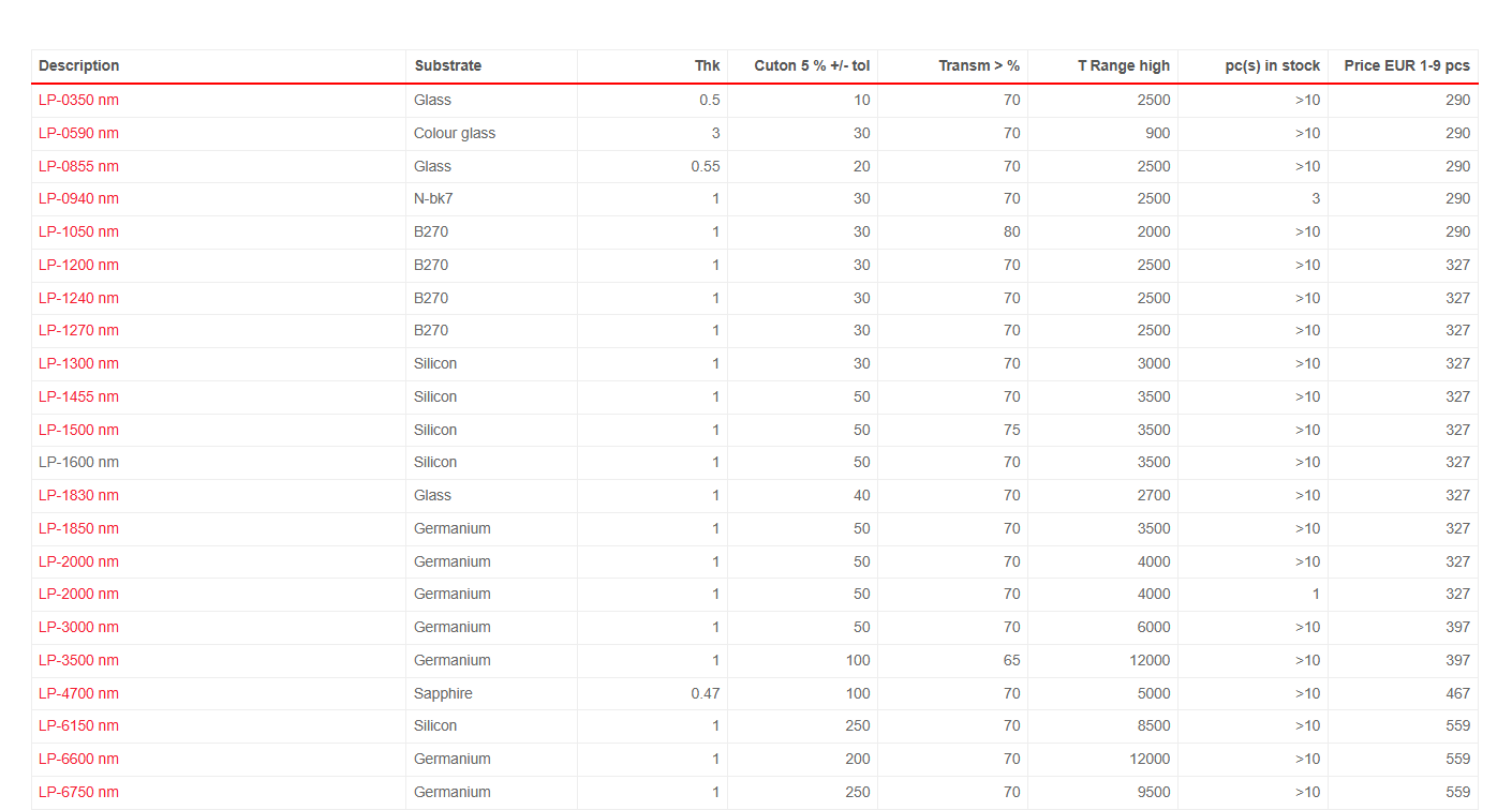 标准长波段通滤波器有库存,先到先得(波长范围:UV, VIS, NIR & IR)。