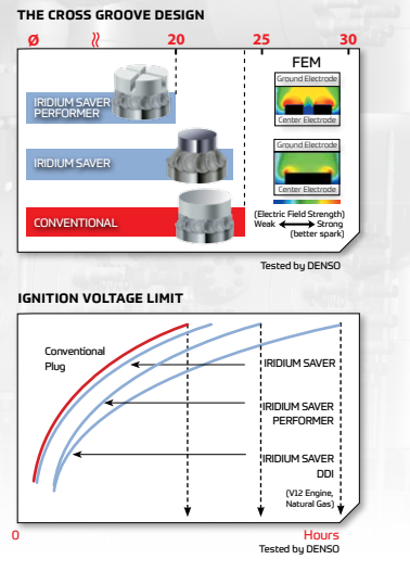 采用中心电极无横槽铱金片、三接地电极(提升点火效率)以及中位接地电极铂金片的设计。