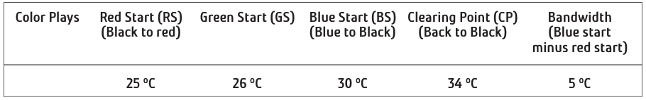 TLC涂层薄板应保持其色彩特征数月。在高温(50ºC+)水浴中持续浸没和温度循环会加速降解,在一般的高温下持续温度循环和暴露在紫外线下也会加速降解