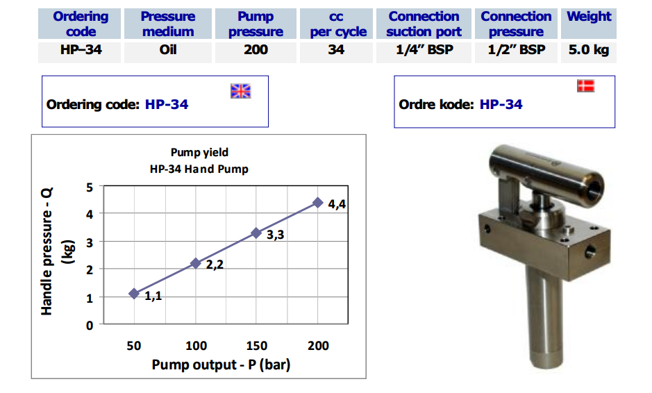 该泵设计用于简单的提升功能,例如与工作平台和升降台上的不锈钢液压缸一起使用,或作为备用泵。