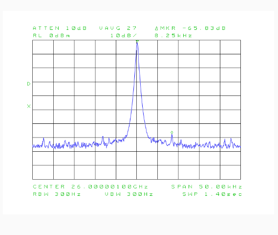 Valon 5030频率合成器采用多个相位锁定环路,在18GHz至32GHz范围内提供极低的相位噪声。这种多环路技术在提供高分辨率调谐精度的同时,大大降低了杂散信号。如左侧26.000001GHz信号的图表所示,边界杂散信号在大多数频率下均极低。校准和电平化的输出功率在时间与温度变化下保持准确稳定,范围从至少+15dBm到-15dBm,步长为0.01dB。