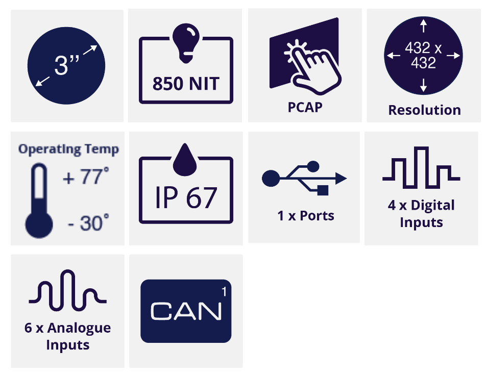 3″ CAN总线显示器 配备圆形彩色PCAP触摸LCD。R3作为OEM(原始设备制造商)产品设计,不直接向终端用户销售。R3是首款全圆形、边到边的触摸屏显示器,是我们现有系列坚固可靠的CAN总线显示器的一部分。它结合了传统模拟仪表的外观与现代数字技术,并且通过定制软件开发,能够根据应用需求改变外观和功能。