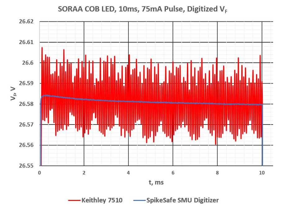 该数字化采集器可在 500 ksps 的采样速率下测量器件正向电压(Vf),并能捕捉脉冲工作过程中出现的毫伏级电压变化。