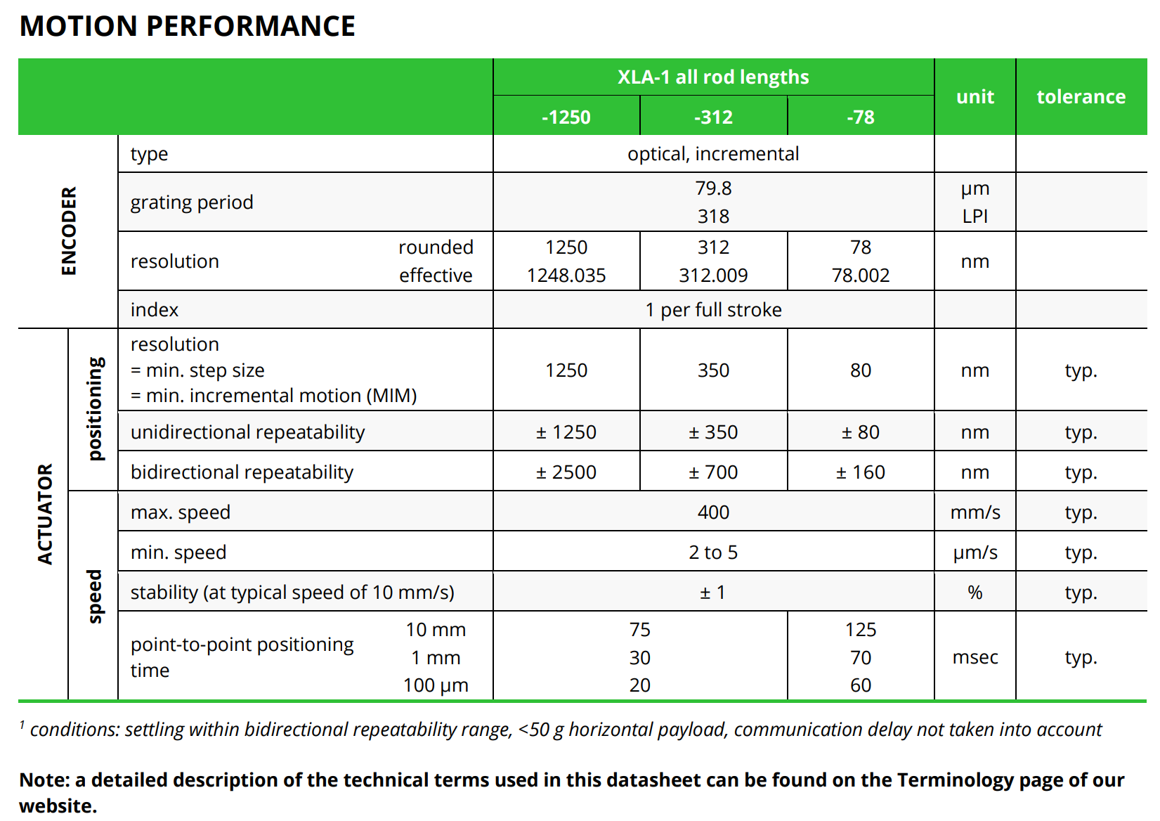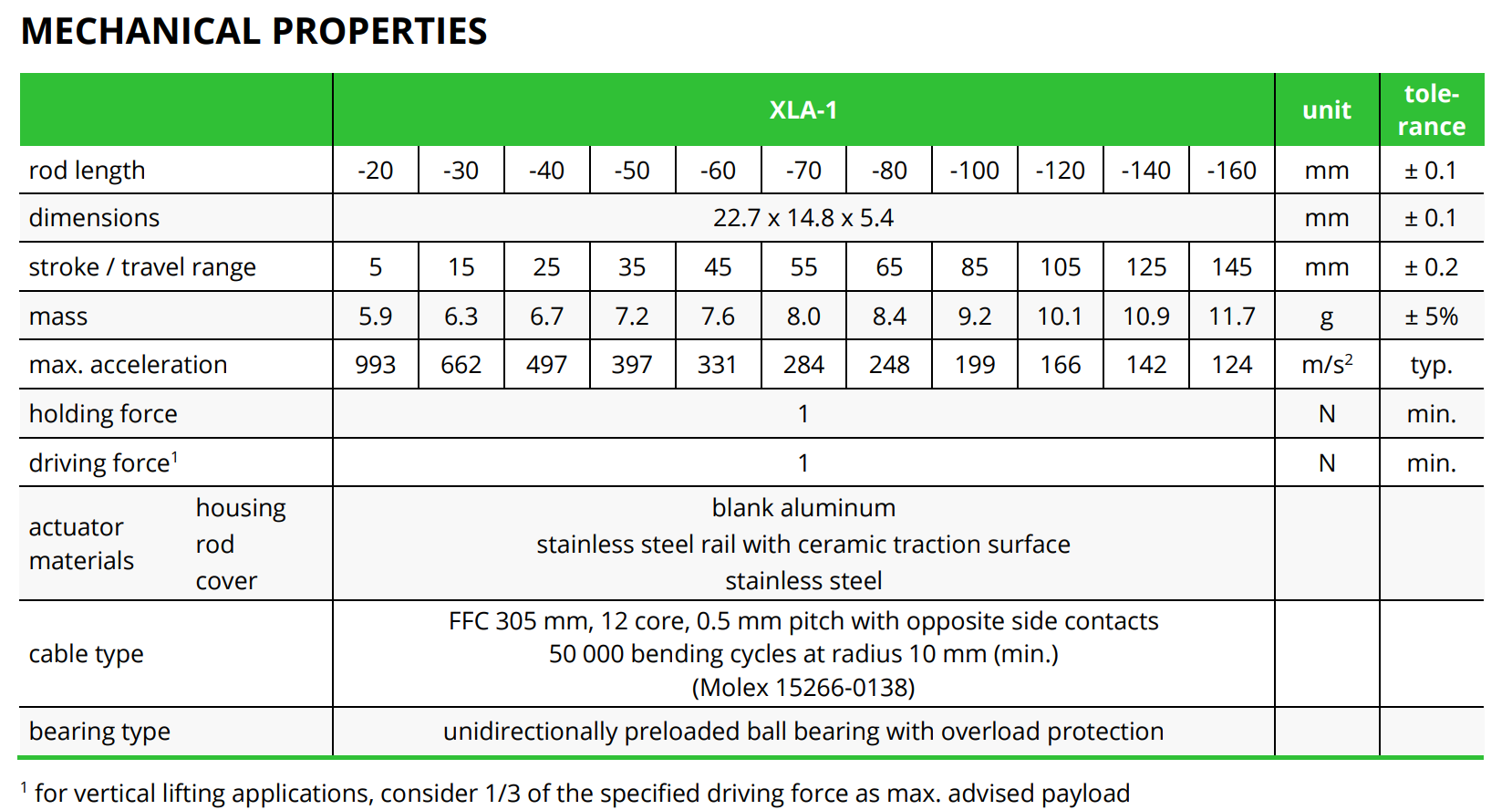 Xeryon XLA-1系列 微型线性执行器机械参数: