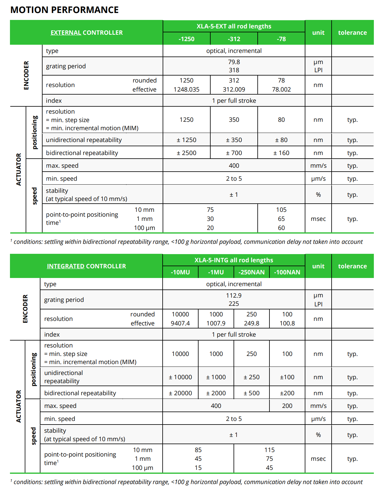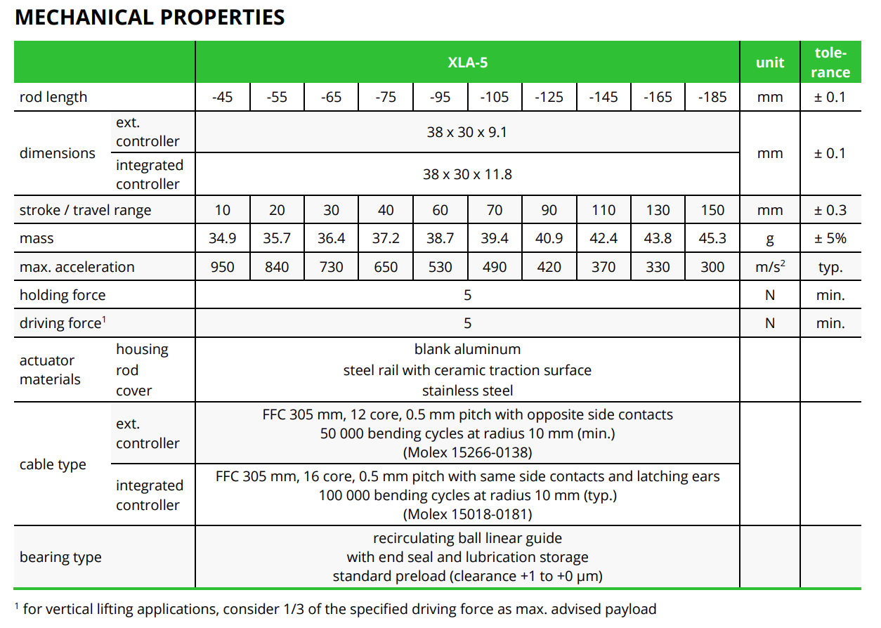 Xeryon XLA-5系列 微型线性执行器技术参数: